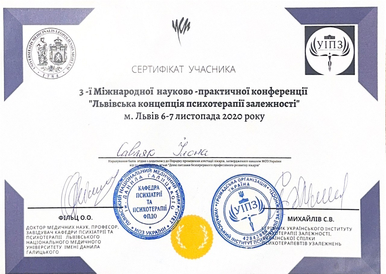 - 3-я Міжнародна науково-практична конференція “Львівська концепція психотерапії залежностей”, Львів – 2020 р.