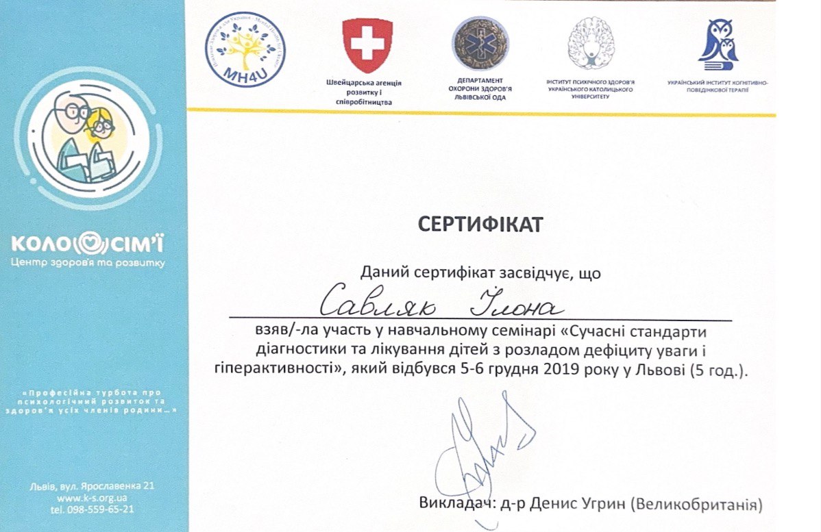 - Навчальний семінар “Сучасні стандарти діагностики та лікування дітей з розладом дефіциту уваги і гіперактивності”, Львів – 2019 р.